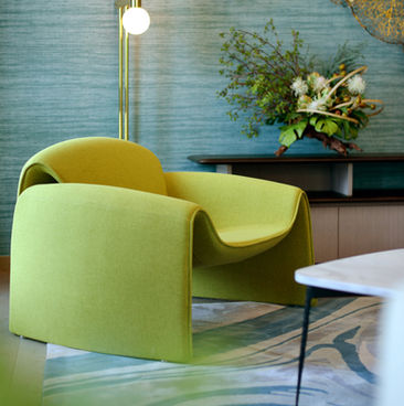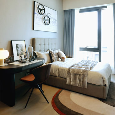 Experience Ocean Tranquility, a show unit that seamlessly blends the serene beauty of the ocean with modern luxury. A soothing blue palette sets the tone, highlighted by silky blue walls and floor-to-ceiling ocean-blue curtains.